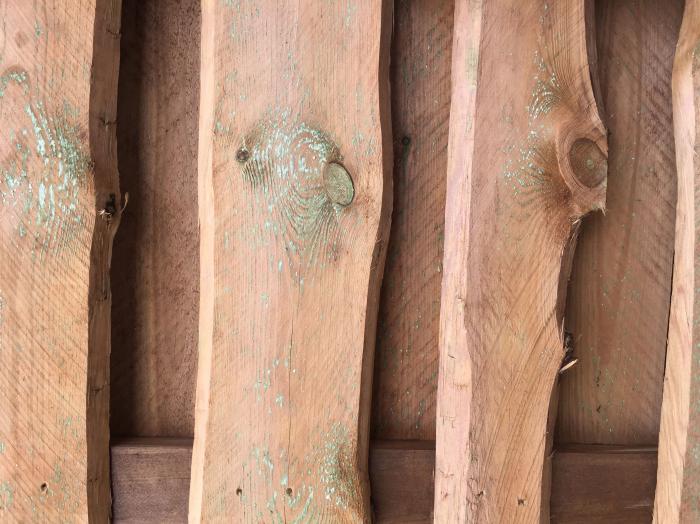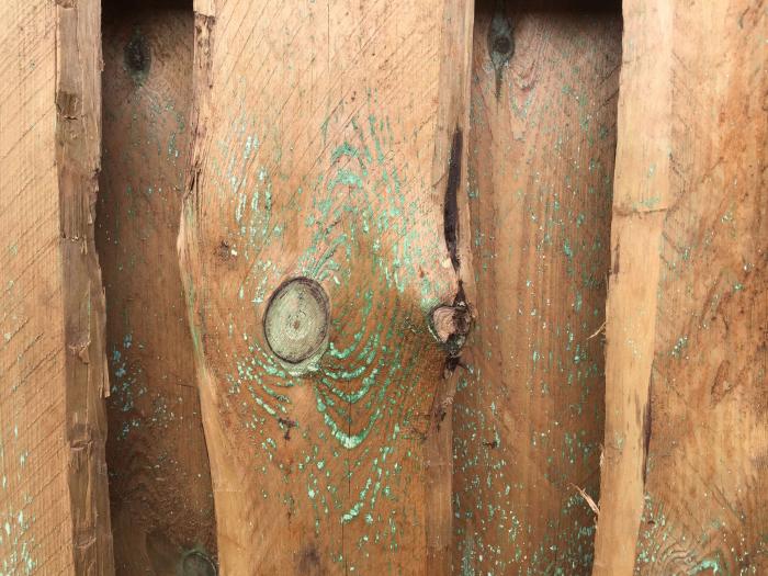 Ein typisches Merkmal für druckimprägniertes Holz sind grün-weiße Ablagerungen von Imprägniersalz und Harz an der Oberfläche. Diese wittern im Laufe der Zeit ab. Bei Bedarf lassen sich die Ablagerungen mit einem Abziehmesser oder Terpentinersatz entfernen.