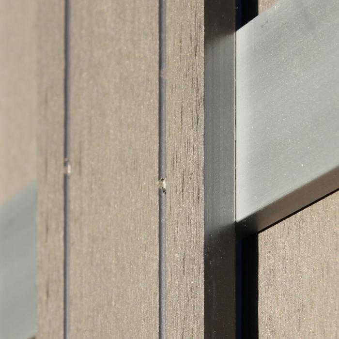 Für eine stabile Verbindung sind die Zaunbretter aus WPC jeweils doppelt mit den Zaunriegeln aus Aluminium verschraubt. Für die Verschraubung werden werkseitig Edelstahlschrauben verwendet.