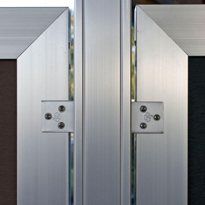 Die Befestigung der Zaunelemente Forte an den Pfosten aus Aluminium erfolgt mittels der speziellen Winkelbeschläge aus Aluminium. Für jedes Zaunelement werden dabei drei Winkel pro Seite, also insgesamt sechs Winkel benötigt. Dem Elephant-Befestigungsset