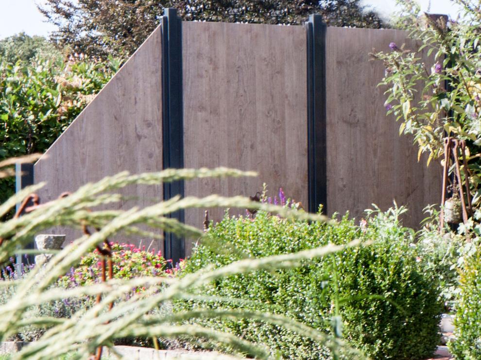 Zaunelemente im Design Holzoptik (Reproduktion) wurden hier mit Pfosten im Farbton anthrazit kombiniert. Die Zaunelemente wurden mit Klemmschienen an den Pfosten befestigt. Entsprechend ist die Verbindung blickdicht.