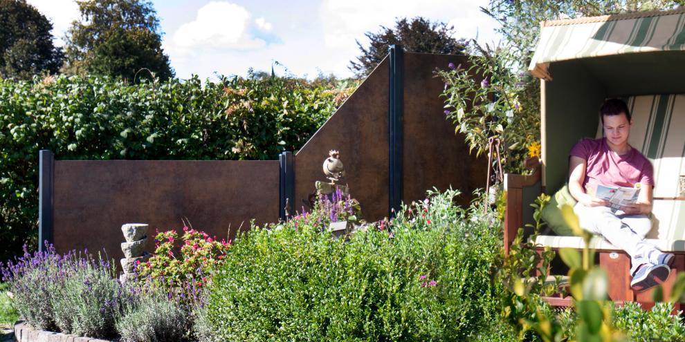Durch die verschiedenen Formen der Zaunelemente lassen sich Zaunanlagen in abgestuften Höhen realisieren. Das Beispiel zeigt Zaunelemente in Rostoptik in Verbindung mit Pfosten und Klemmschienen in anthrazit.
