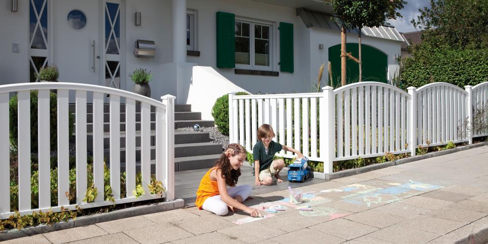 Weißer Vorgartenzaun CLEO aus hochwertigem Fensterkunststoff.