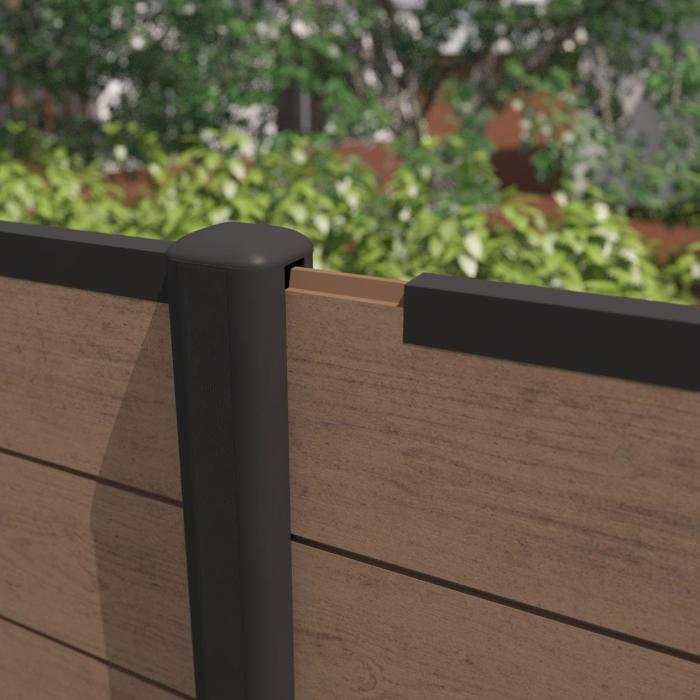 Für verwinkelte Zaunanlagen aus System-WPC gibt es einen praktischen Eckpfosten. Mit diesem Eckpfosten ist die Einstellung des Winkels von 75° bis 180° möglich. Diesen Eckpfosten gibt es sowohl in der Variante zum Aufdübeln als auch zum Einbetonieren.